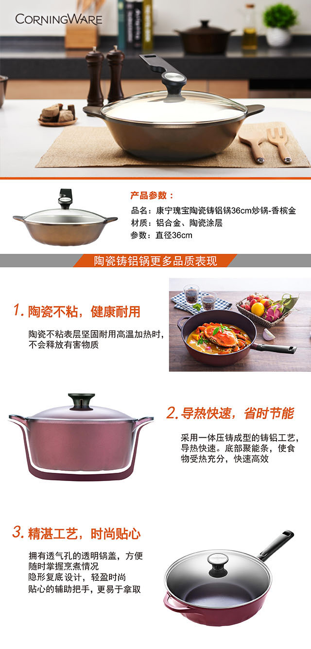 康宁瑰宝陶瓷铸铝锅36cm炒锅—香槟金