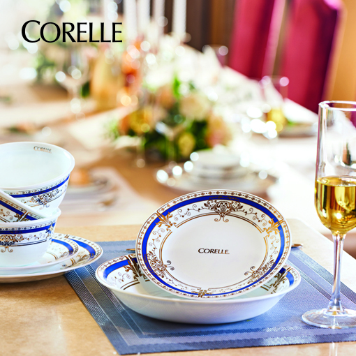 Corelle鎏金岁月系列,花纹设计融合哥特式教堂窗花中的蔓草吉祥纹,花色整体采用金线细细勾勒,外圈衬托以宝石蓝,再搭配时尚的对称设计,每一件器形,都是餐桌上耀眼的点缀。