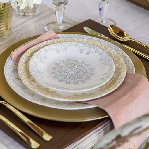 金色和银色为主调的花纹图案,繁复美丽却细致,自带优雅沉静的气息,却又张扬大胆地几乎占满了整个餐具,犹如身姿灵动的舞者,无声倾诉化作舞步,目光流转,裙带飘舞谱出华章。