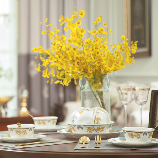 以地中海为主色,利用蓝色的渐变来衬托餐具整体的空间感,沉稳而不失华丽,再以真金勾勒巴洛克波浪曲线,如同海中孕育的金色珍珠,与海蓝相得益彰,晶莹而凝重。